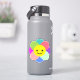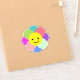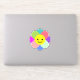 Colourful cartoon flower with a big round happy yellow face. It has eight petals in green, blue, green and red.