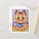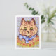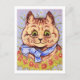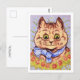 A fine art postcard featuring an animal illustration of a green-eyed orange tabby cat adorned with a garland of daisy flowers and blue bow, Happy Flower Cat, created by the English artist Louis Wain (1860-1939). Wain was a renowned illustrator during the art nouveau period. He is celebrated for his distinctive and charming cat portraits. This portrait is characteristic of his unique and endearing style.