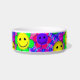 This is a heavy, durable bowl decorated with Tibbies of many colors, the perfect size for hungry/thirsty Tibs. The design is interesting and printing clear.