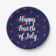 Happy fourth of July modern script text red white and navy blue stars pattern cute fun festive holiday Party Paper Plates.