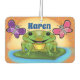 A happy green frog surrounded by a pink butterfly and a purple butterfly with a halo of sunlight around him as he sits on his green lily pad floating in the blue water makes up this fun air freshener. Customisable so you can add your own text and change the background colour. Makes a great gift!