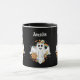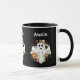 A mug with an illustration of a smiling ghost. Decorated with flowers, rainbows and bats.