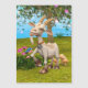 3D digital render of a happy cartoon goat on a fantasy garden background