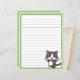Cut happy grey kitten on lined paper, with abstract green boarder.