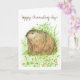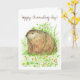 A Happy Groundhog Day greeting card decorated with a fluffy woodchuck drawn in pen and ink with coloured pencil with spring flowers blooming.