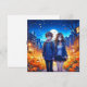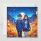 Anime couple holding hands on Halloween night surrounded by pumpkins and city lights.