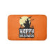 Happy Halloween text design illustration with haunted house, cemetery and bats decoration at full moon on grunge orange background