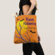 This Halloween tote bag features a bright yellow full moon on an orange background, with a tree branch and three bats in the foreground. The "Happy Halloween" text can be customised and there's an area for you to add additional text.