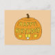 A giant cartoon pumpkin, with three hearts and 'Happy Birthday' carved out of it. The image has a peach colored background.