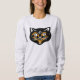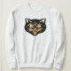 This sweatshirt has the head of a vintage Halloween black cat with a happy face and orange and white accents and open mouth.