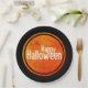 This spookily simple design is sure to get your guests in the Halloween mood! The design features a jack-o-lantern and bat over an orange marbled circle and black background, with the words "Happy Halloween".