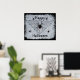 A black widow spider is sitting in her triangular spider web waiting for the next prey, surrounded by additional spiders. She has the famous red hour glass mark of a black widow. The background is a painted white texture on black. Image is my original drawing. All text is customisable with templates. See my store Art by MAR for matching products with this design.