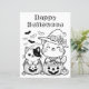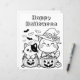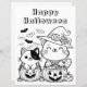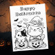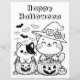 Happy Halloween colouring page for kids. Cute Halloween cats, bats and pumpkins.