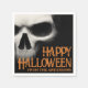 Happy Halloween paper napkins featuring a white, creepy skull aligned to the left on a black background with your custom name and orange text “Happy Halloween” in an ornate, gritty font aligned to the right.
