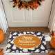 Happy Halloween Cute Ghost Personalised doormat features a black and white ghost pattern with "Happy Halloween" centred in a white script font. Personalise it with your family.