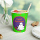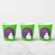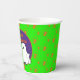 Cute ghost Halloween party paper cups in bright purple, orange and green colours. The designs are an adorable ghost holding a pumpkin basket with an orange spider pattern background. The text reads: Happy Halloween but can be change using the personalise this product button.