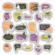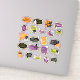 Fun, whimsical, spooky Halloween stickers featuring a witch, black cat, spider, spider web, bat, pumpkin and skull and cross bones.