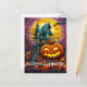 This unique postcard features a spooky pumpkin after dark, in front of a haunted house.