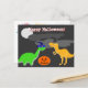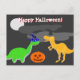 Happy Halloween Greetings Dinosaurs Postcard. A cute little green cartoon Diplodocus dino with a halloween wizard hat and an orange T-Rex with black witch hat and an orange halloween pumpkin in a dark night with the full white moon in the sky postcard. This "Happy Halloween!" dinos postcard is fully customisable! Change the text "Happy Halloween!" and add your images & texts! A cute Halloween greetings dinosaurs card!