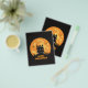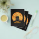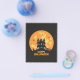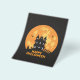 A creepy haunted house with a full moon and text "Happy Halloween".
