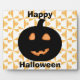 A festive, smiling Happy Halloween pumpkin sits atop a custom digitally designed pattern of streaming abstract pinwheel shapes.