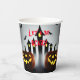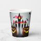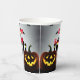 Happy Halloween - Let's be Scary Paper Cups with Creepy Jack o Lantern and flying bats for your Halloween party table décor. Design features a nocturnal scene with carved pumpkins in the foreground with witchy buildings in background and bats flying in the night sky. Part of the Creepy Jack 'o Lantern Collection. The wording can be changed as desired by using “Personalise this template” or the “Edit design” tabs. By using the “Edit Design” tab you can change the font style, size and colour. Happy Halloween!