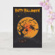 Black background with dead tree, sitting in the tree is a spooky owl! Under the tree are Halloween pumpkins! A witch flying on her broomstick highlights this spooky card that is great for a Halloween party invitation! Happy Halloween text can be edited! Text or photographs can be added to the inside of card! Pick up matching postage!