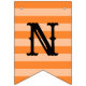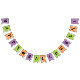 This festive "Happy Halloween!" holiday bunting banner features orange, purple, green, and black colors, patterned stripes and polka dots, decorative text, and a smiling jack-o-lantern pumpkin accent.