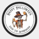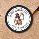 Give some adorable party favours to guests at an annual Halloween costume party, or any event with this fun and simple sticker. A simple overall black and white look that has a simple vintage grunge typography. A drinking skeleton with top hat and orange vest gives it some character. Outlined with black circles. Personalised Fun Spooky Pirate Drinking Skeleton Happy Halloween Party Classic Round Sticker