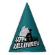 Happy Halloween text design illustration with cemetery and bats decoration at full moon on grunge blue background