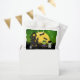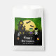 This fun and spooky favour bag features cute Frankenstein monsters beside a crooked haunted house. In the background is a full moon with bats and a green night sky with stars. The text combines decorative and serif fonts for a stylish and modern look. This is perfect for a Halloween party.