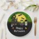 This fun and spooky plate features cute Frankenstein monsters beside a crooked haunted house. In the background is a full moon with bats and a green night sky with stars. This is perfect for a Halloween party.