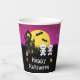 This fun and spooky paper cup features cute mummies beside a crooked haunted house. In the background is a full moon with bats and a pink night sky with stars. This is perfect for Halloween.
