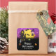 This fun and spooky sticker features a cute witch beside a crooked haunted house. In the background is a full moon with bats and a purple night sky with stars. The text combines decorative and serif fonts for a stylish and modern look. This is perfect for a Halloween party.