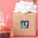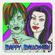 Pop art style vampire and zombie lime green and purple Happy Halloween stickers.