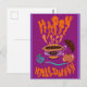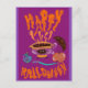 Original illustration of a cat lover witche’s cup of coffee with poisonous potion, witch a bat, pumpkin, magic wand and little steam ghosts with hand lettering saying Happy Halloween. In orange and purple bold maximalist style and colours.