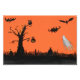 Happy Halloween illustration. Orange background- tree, graves, owl, bats, spider.