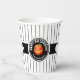This paper cup features a Halloween pumpkin on a round black label with the text 'Happy Halloween'. Personalise with your name or other text. Background is a narrow black and white striped pattern. Search ID212 to see other products with this design.