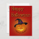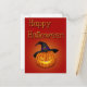 Halloween pumpkin with a witch hat and "Happy Halloween" written with bones on a red background.
