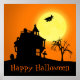 Happy Halloween illustration featuring a spooky black landscape with a scary house, a creepy tree, bats and a witch flying on her broom; all on an orange background with the full shiny moon.