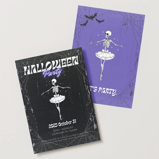 The perfect addition to your 2025 halloween party- this one-of-a-kind design featuring a skeleton ballerina, bats, cobwebs, and the words "Happy Halloween" with a purple potion background will surely make a great addition to your party aesthetic. Perfect for anyone planning their halloween house party, work events & more!