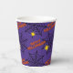 Decorate your Halloween parties with these cool paper cups. The design features spiders and spiderwebs on a purple background. Orange Happy Halloween text.
