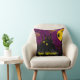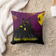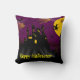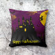 Halloween themed pillow featuring haunted castle, a witch flying to the moon and bats surrounding the castle with Happy Halloween customisable text at the bottom. Back side is plain black.