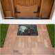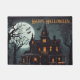 Halloween themed doormat features haunted house at night with carved pumpkins, bats, and full moon. Personalise it with your text!