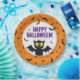 Happy Halloween smiling vampire bat featuring a full moon with all his bat friends flying to to say "HAPPY HALLOWEEN!"