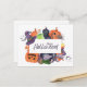 This beautifully illustrated Halloween postcard features a charming watercolor design, showcasing classic Halloween elements such as a witch's hat, a black cat, pumpkins, and a spooky spider. The "Happy Halloween!" message is elegantly placed in the centre, surrounded by a colourful array of festive decorations. Perfect for sending Halloween greetings with a touch of artistic flair, this postcard combines traditional Halloween icons with a soft, hand-painted look that is both playful and sophisticated.