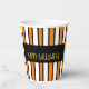 Add a touch of fall fun to any party with these fun striped paper cups. The design features vertical stripes in white, black and orange, giving this design a Halloween look. The black band , in the centre, reads "HAPPY HALLOWEEN". You can customise the text and change the colour of the black band.