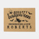 Classic and elegant Halloween doormat for fall - "Happy Halloween" text with bats, a flying witch, a spider, and your family name