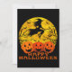 Funny Happy Halloween Witch On Broom With These Cute Smiling Pumpkin Behind The Yellow Bright Moonlight With Flying Bats And Silhouette Trees And Lady Witch. Invite Your Friend For Your Halloween Party.