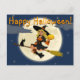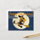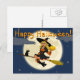 Happy Halloween! What better way to say it than with a cute Halloween postcard? Design features a witch with her loveable cat flying on a broom over a large, full moon in a starry sky. The witch is wearing a festive black and orange dress, a black corset, orange and black striped socks, black boots, and tops it all off with a black and orange hat. She's holding a jack o'lantern in her hand as her mischievous cat looks curiously over his shoulder. Postcard is customisable, so feel free to change fonts to your liking.